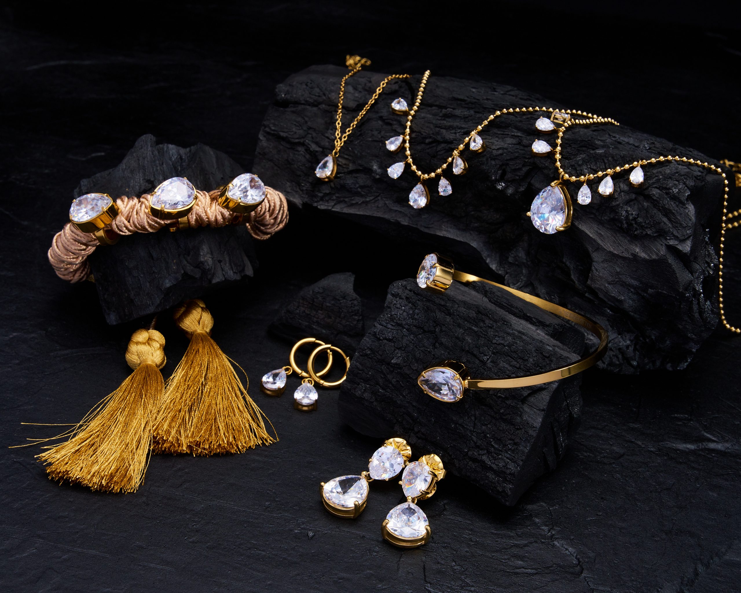 Cadena, Pulsera y Zarcillos de Balines Dorados