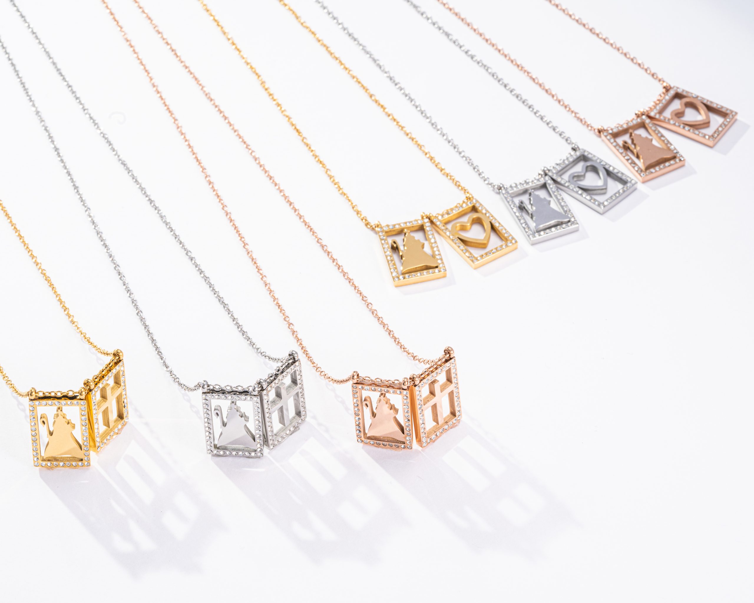 Escapularios Divina Pastora con cruces y corazon con detalles de cristales incrustados.