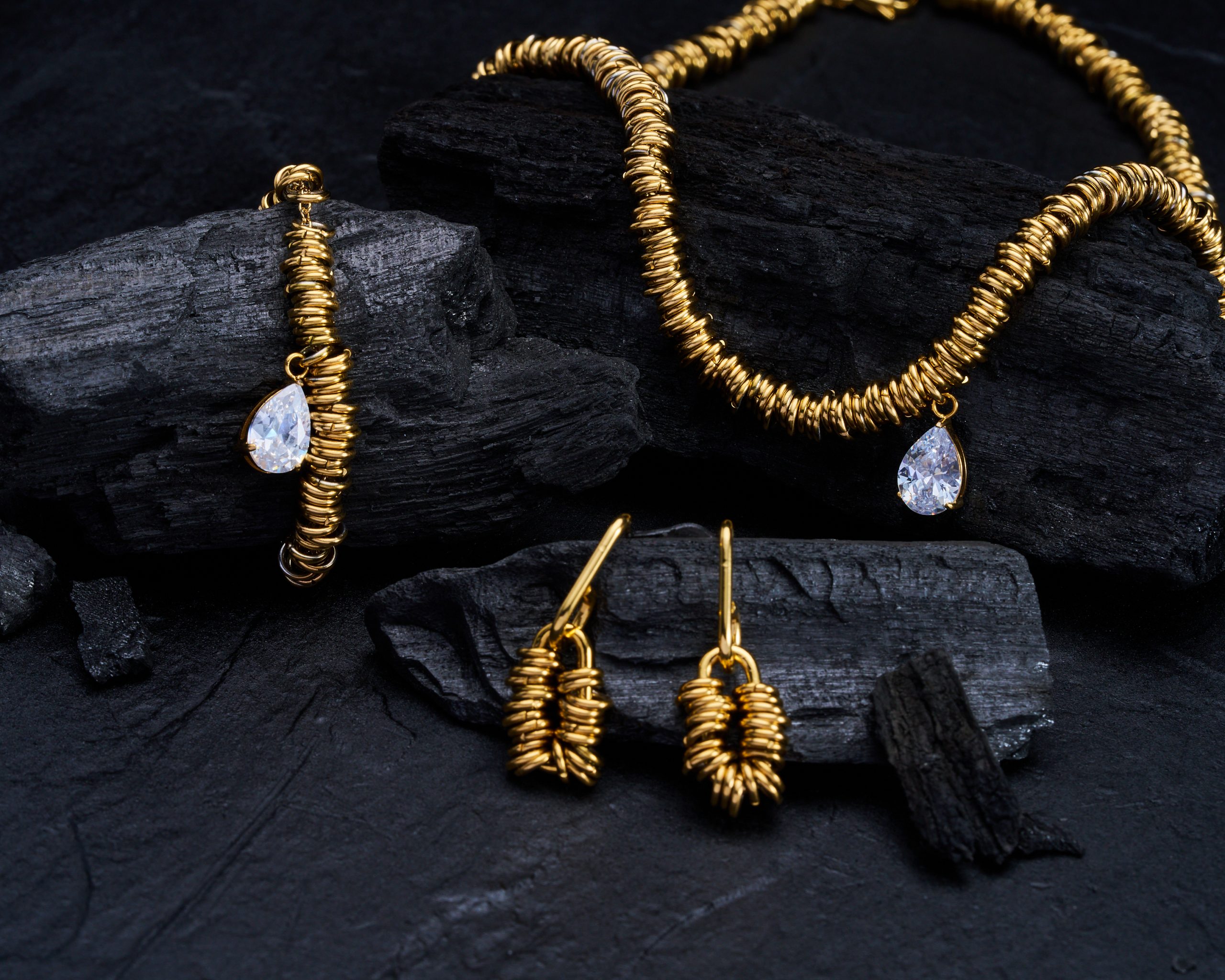 Cadena, pulsera y zarcillos de base con argollas doradas con dije de gota con cristal incrustado